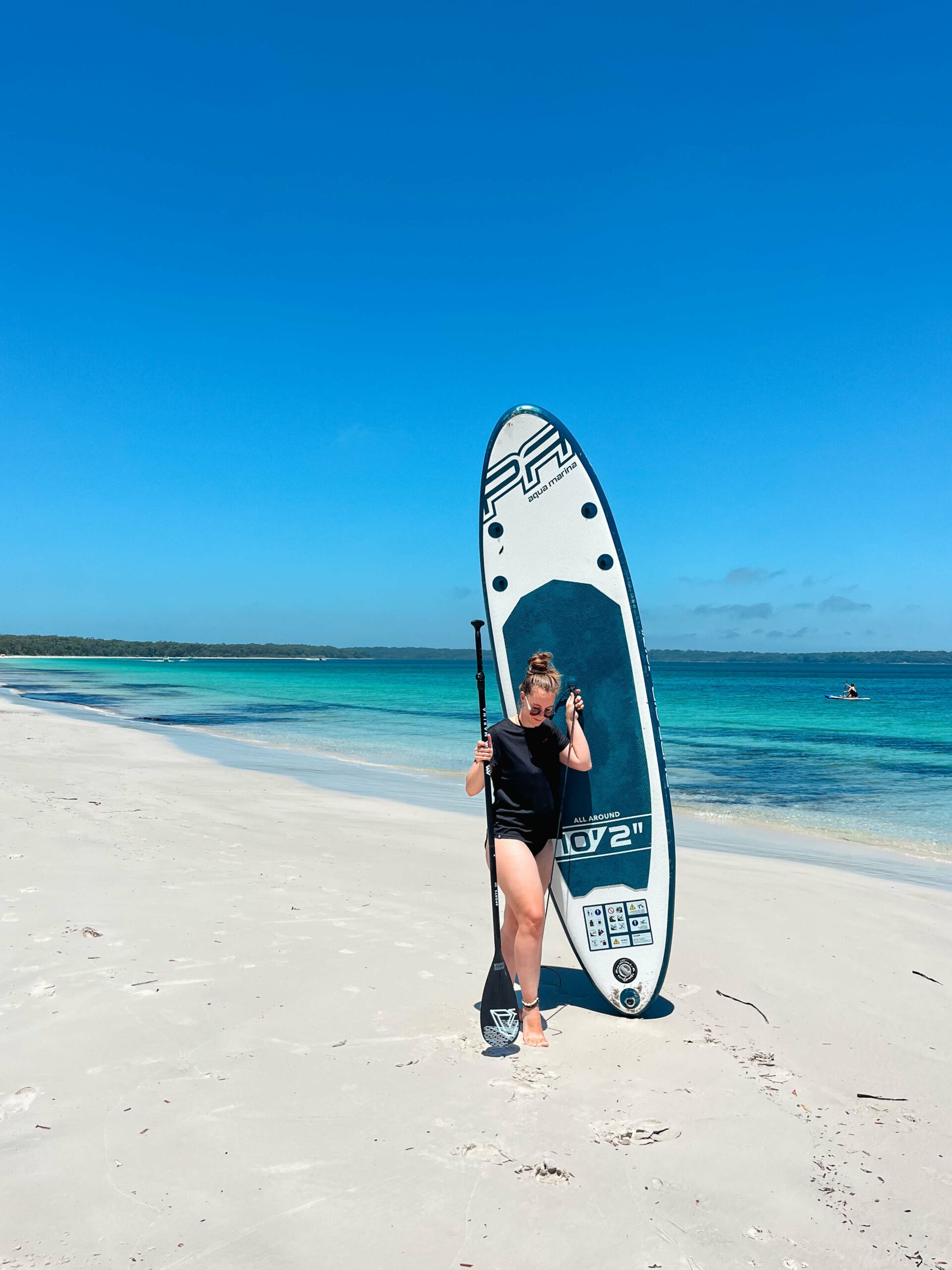 Om kwart over 9 stonden we klaar in de baai om aan boord te gaan van de boot. De dag begon erg mistig, maar gelukkig klaarde het helemaal op tijdens onze tocht waar we hebben kunnen genieten van een grote groep wilde dolfijnen die voor onze boot uit zwom. Dolfijnen vinden het namelijk erg leuk om met de stroming van de boot mee te zwemmen. Hierna zijn we naar een ander mooi strand van Jervis Bay gegaan, waar het een stuk rustiger was. We hadden het strand en de baai bijna voor ons alleen. Hier hebben we nog een leuk stuk gepeddeld op onze sup genietend van het mooie uitzicht. Vervolgens zijn we vertrokken naar onze volgende camping in Kangaroo Valley. Kangaroo Valley staat verrassend genoeg niet bekend om kangoeroes, maar om de grote groep wombats die hier rondloopt. Een wombat is weer een ander soort buideldier die alleen in Australië voorkomt, net als koala’s. De wombats kwamen tevoorschijn op de camping tijdens de zonsondergang. We hebben zelfs een selfie met een van de schattige beestjes kunnen maken!