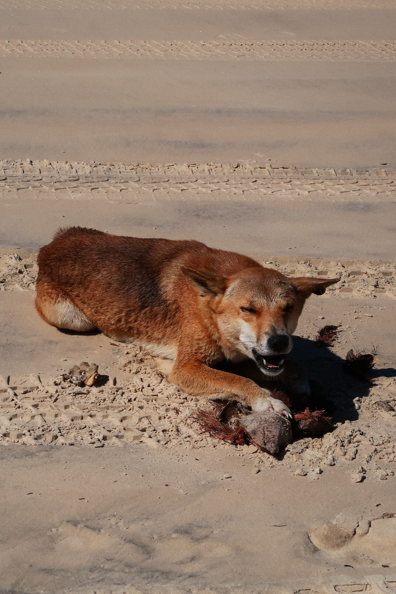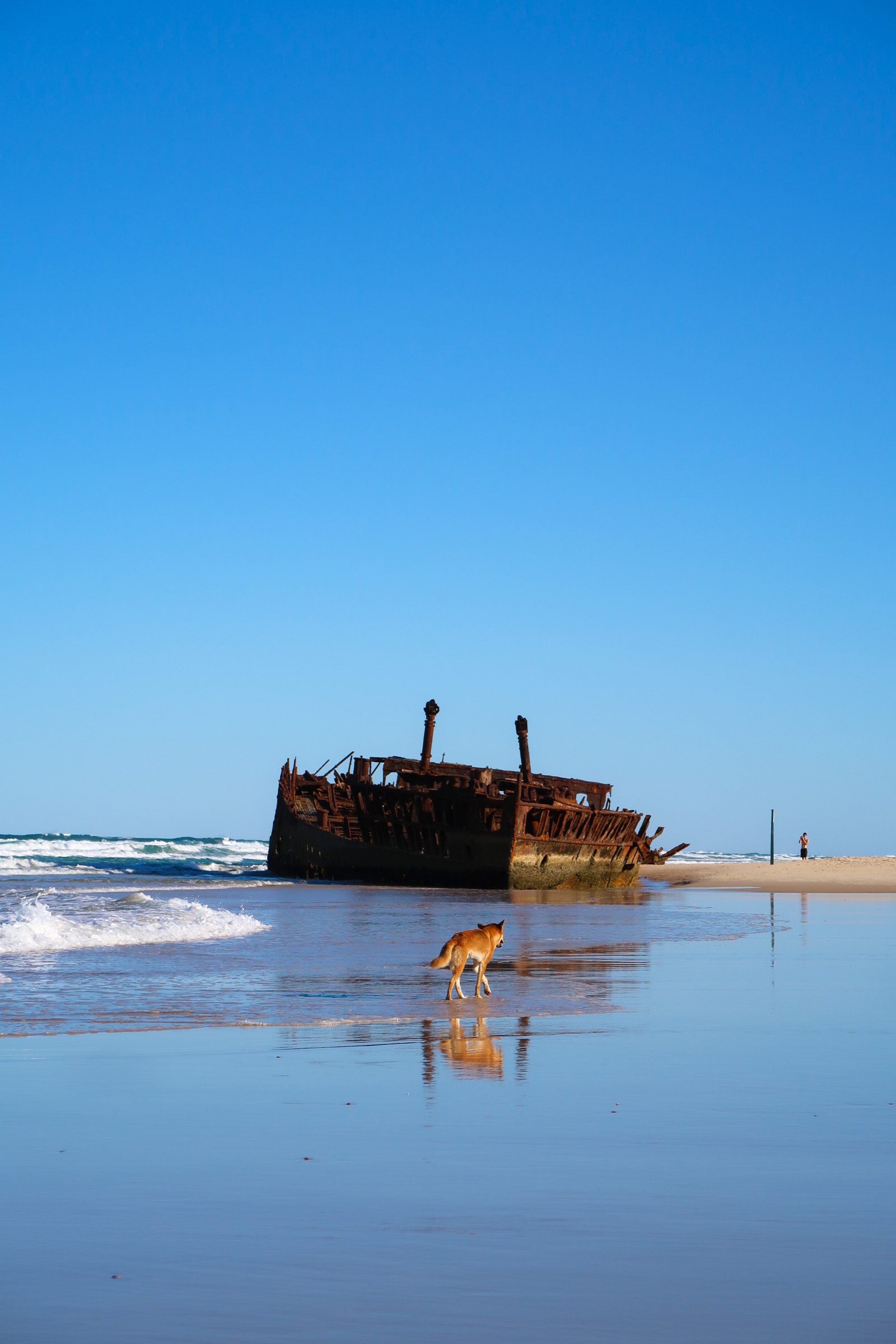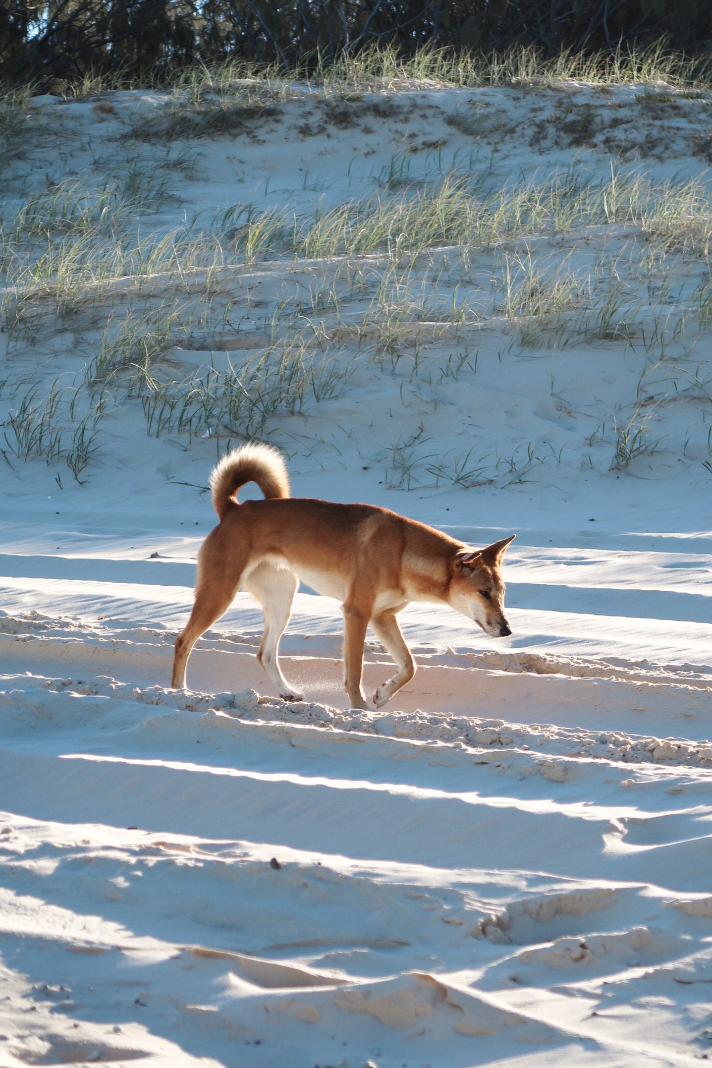 K’gari staat bekend omdat het het grootste zandeiland ter wereld is en een grote wilde dingo populatie heeft. Wij hadden ervoor gekozen om zelf een 4WD auto te huren, zodat we het eiland lekker op eigen houtje konden verkennen. Op de eerste dag hadden we direct geluk dat we een wilde dingo zagen op één van de binnenlandse wegen die een stukje voor ons bleef lopen, alsof hij ons de richting wees. Daarnaast hebben we meerdere keren wilde dingo’s op het strand gezien.
