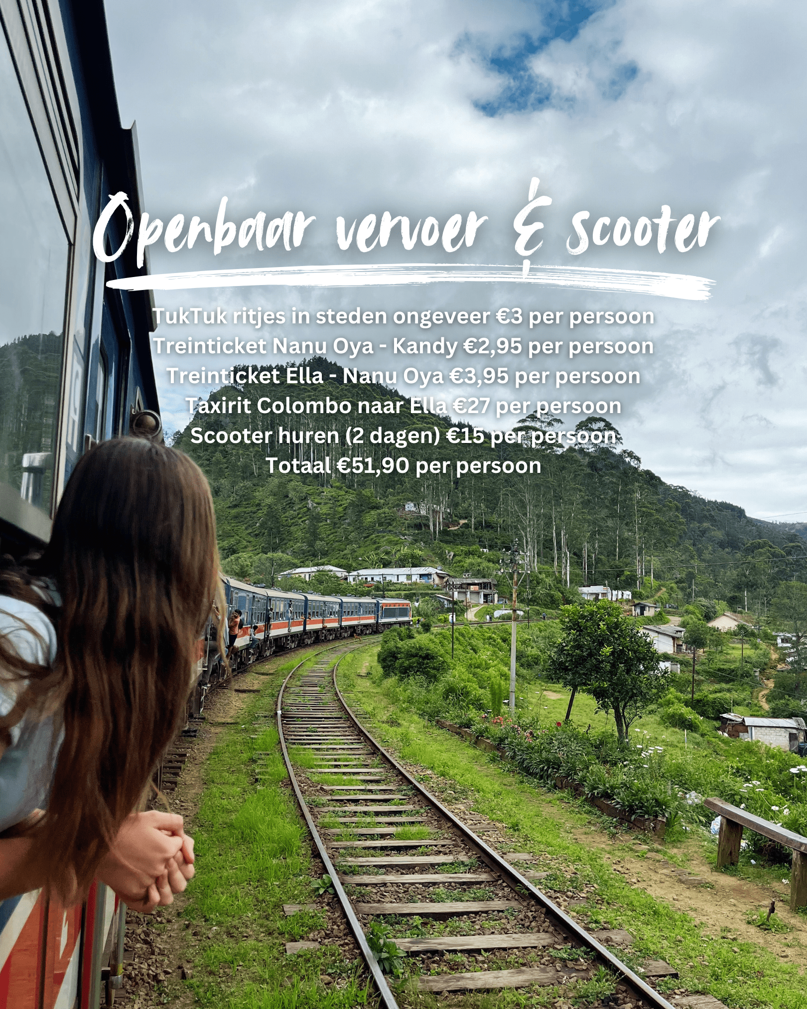 Er zijn verschillende manieren om van A naar B te komen in Sri Lanka. Zo kan je gebruik maken van de taxi, trein, bus, tuktuk of door zelf een voertuig huren. Wij hebben in het eerste deel van onze reis gebruik gemaakt van het openbaar vervoer en het tweede deel van onze reis hebben we een eigen tuktuk gehuurd. Dit waren onze kosten:
